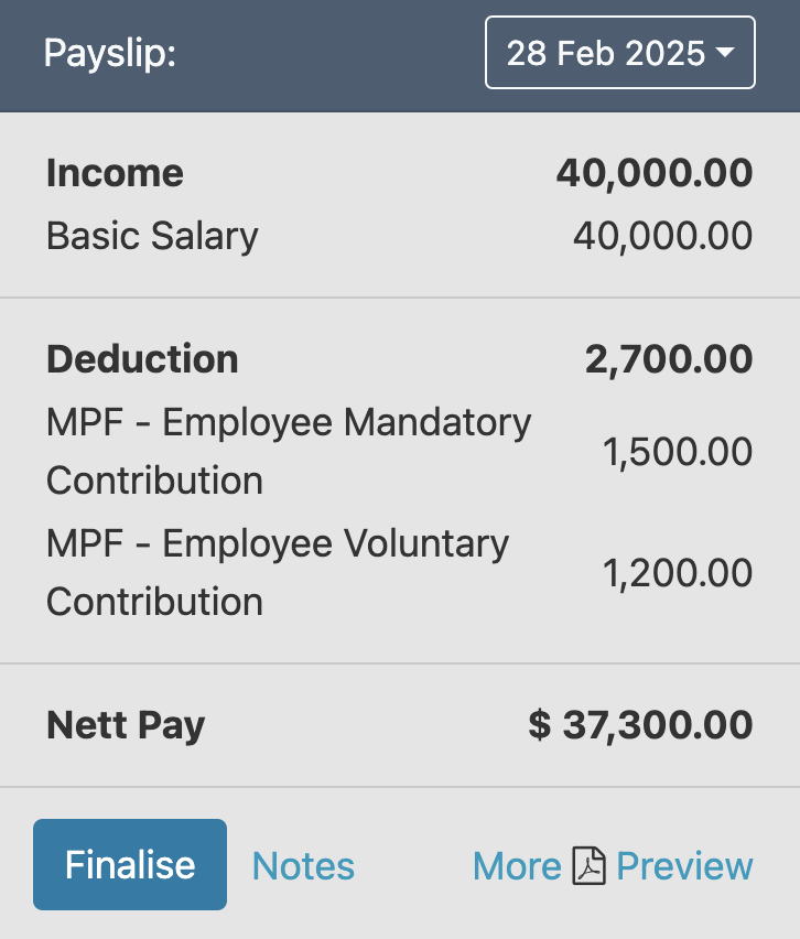 SimplePay automatically calculates statutory deductions for MPF (if applicable), and you will see these in the Payslip block, along with all of the other items you added above. When viewing the information in the Payslip block, you have the following options: